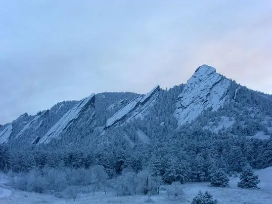 Flatirons i Boulder. Var på en kvällspromenad i skymningen och tyckte att "hemmabergen" såg vackra ut under nysnön.