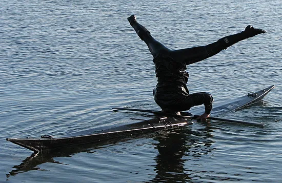 Om man tycker det är för lätt att stå upp i kajaken kan man stå på huvudet!