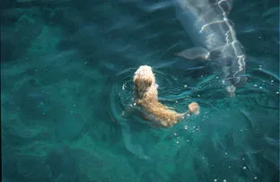 Strandhunden Jacko simmar med de vilda delfinerna i Dolphin Reef, Eilat