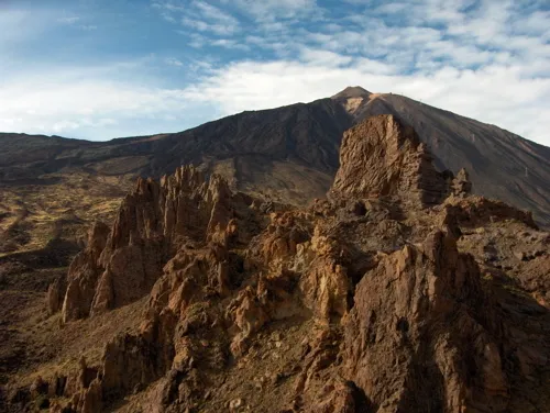 Vyn over Spaniens hogsta berg Teide, sedd från toppen av Las Canadas mest klassiska klatterberg - La Cathedral. I forgrunden ses resten av klatterområdet Los Roques de Garcia.
