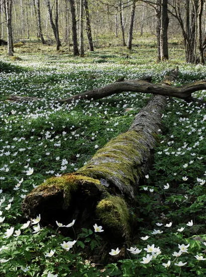Underbar bild med snygga linjer. Snyggt att utgå ifrån lågan i kompositionen. Mossan och trädstammen ger verkligen känslan av det gamla medan våren och det nya blommar runt om.
