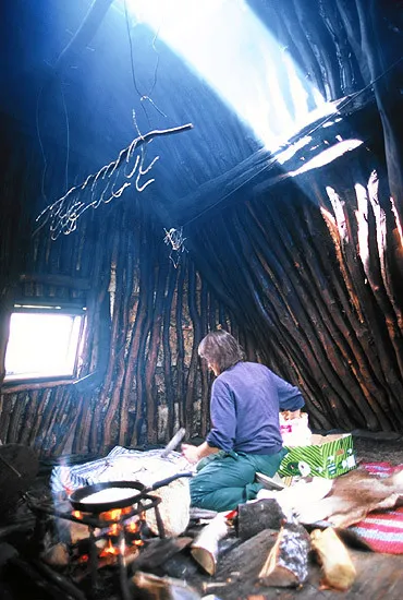 Här bakas det glödkaka i en kåta i Arasluokta. Smeten i pannan. Brödet vänds en gång, sedan fick det stå och glödgas på högkant, lutad mot en sten vid elden. Smakade otroligt gott efter vandringen från Lådderjåkkå