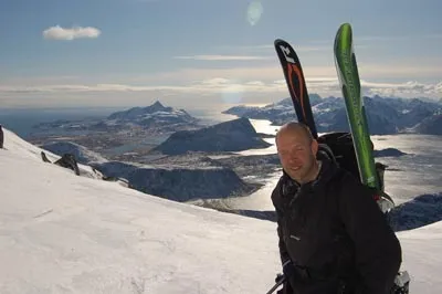 Ganska brant och smal ränna från strax nedom toppen på Himmeltind. Härlig smörsnö. Varmt och gott.