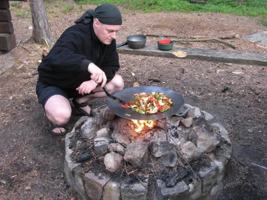 I lugnet som bara störs av knotten sprids en doft av röd curry över tivedsskogen.