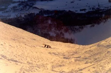 Min kompis vurpade och hamnade rätt upp och ner i snön, endast benen stack upp. Det ser så ut i alla fall.