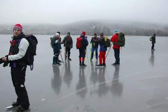 Efter en kortare promenad bort från bron och till säkrare is...