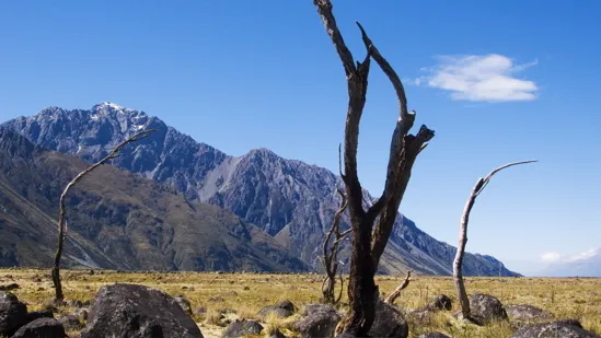 Berg, slätt, himmel och döda träd, snyggt komponerade.