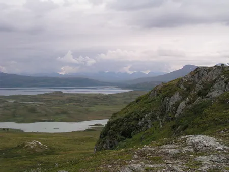 Utsikt över Virihaure mot Staloluokta och Sarekfjällen i bakgrunden. I förgrunden rinner Tukijåkkå ut i Virihaure.
