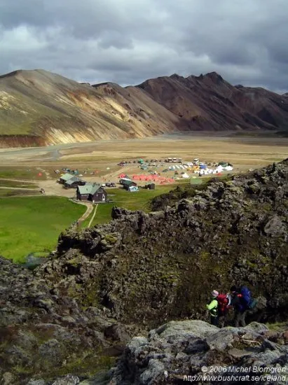 Vandrare framme vid stugorna i Landmannalaugar, Island.