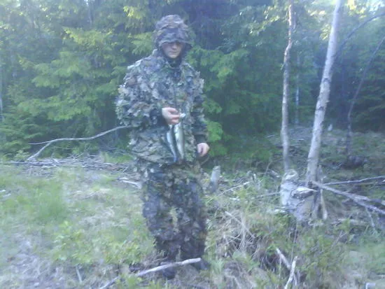 Fann att det gick harr i bäcken som förmodligen blivit infångad av bäverns fördämning efter harrleken. då man var utan fiskespö fick det bli en fiffig lösning med sytråd, en böjd säkerhetsnål och några fina maskar. efter många napp fick jag på den första, efter 15-20min gick den andra fast. det vart en fin middag grillad över eld inlindad i björknäver harsyra och granris.
