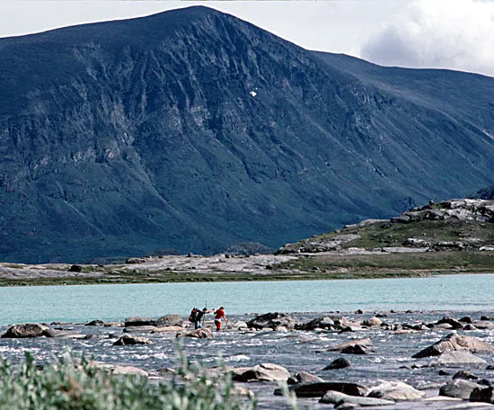 Målet är som med alla vad att komma till andra sidan! Att dessa kallas sjövad beror antagligen på att de går över korta strömmar mellan sjöar istället för över jokkar. Lite mera utmanande eftersom om man ramlar kan man bli utspolad i sjön och kan stå inför en rejäl simtur till land! Jag tror att detta är Alesjaures utlopp, men det kan ev vara nåt av de markerade vaden längre nerströms. Adnjetjårro i bakgrunden. (Brasklapp; dessa vad är tidigt på säsongen livsfarliga eller omöjliga och kan vara omarkerade på nyare kartor.)