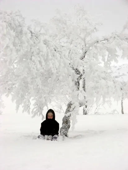 Min lillasyster kämpade sig upp för fjället, men sedan var hon slut och satte sig helt sonika under en av dom snötyngda fjällbjörkarna då hon pustade ut.