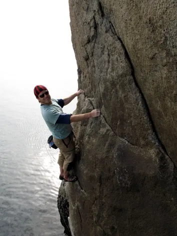 Anders klättrar ut över vattnet på kalle i lofoten.