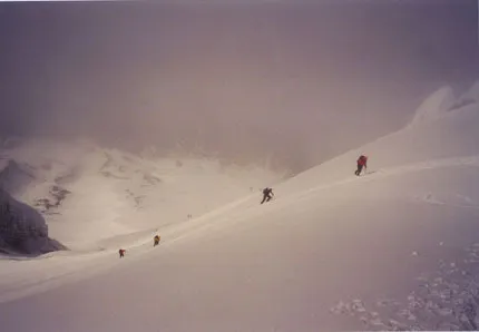 Bestigning av Mt:Hood. Vi hade molnigt väder hela vägen upp. Väl uppe på toppen sprack molnen upp och vi fick lön för mödan!