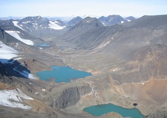 Fotografi över Unna Räita, taget från toppen av Pyramiden (1900 möh). Notera Unna Räitastugan vid övre sjön.