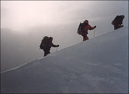 Vi är på väg från Kebnekaise fjällstation, över Björlings glaciär, till Tarfala. Påsk 1996.