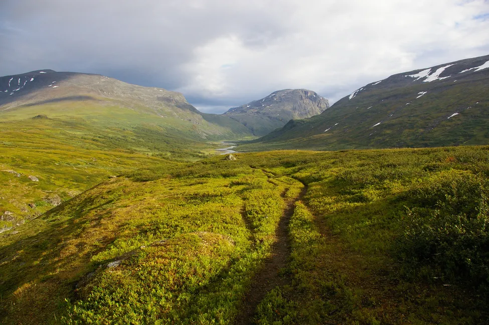 Behagligt släpljus av kvällssolen. Låddebáktes bastanta profil i fonden ger mig glada minnen tillbaka. Renstigarna ser föredömligt vältrampade ut och lämpliga att vandra längs. Inte långt från Mikkastugan förmodar jag? Skulle tippa att Smájllájåhkå forsar fram i svackan till vänster i bild.