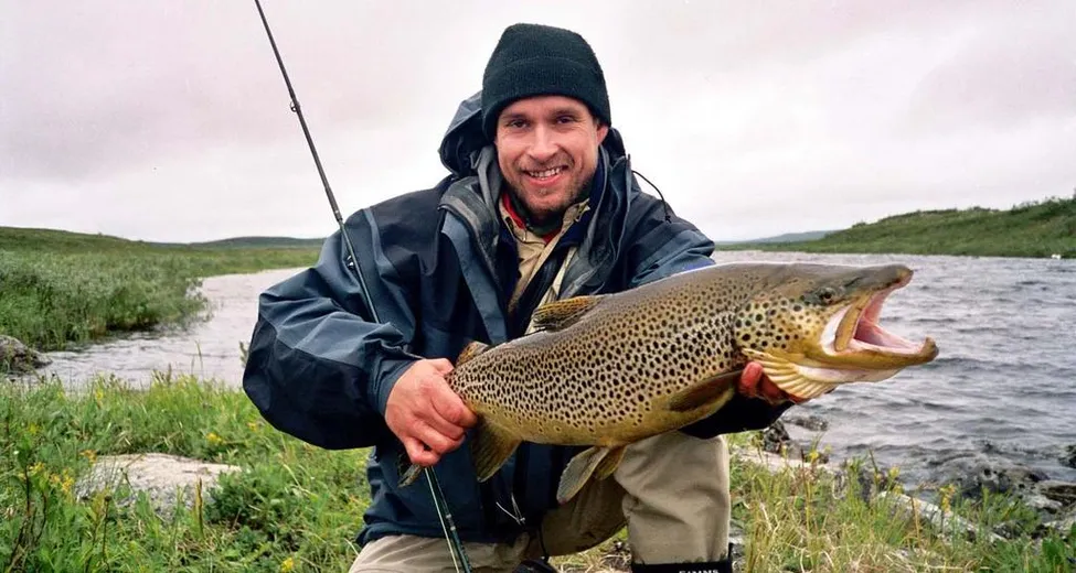 ....sin 3-kilos öring. Tommy Holmberg från Luleå med fin öring. På en vacker nacke togs denna fina öring en sommardag 2001. Kallt som satan var det. Fisken åts på plats med lite nyplockade soppar.