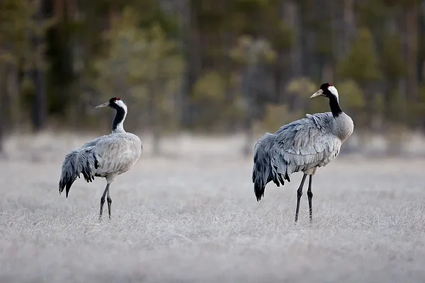 Härligt levande bild i och med att tranorna kollar in något! Mysigt med daggen.