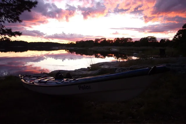 Jätteläcker bild, snyggt med speglingarna och kajakens linjer och den i övrigt mörka förgrunden som framhäver bilden.