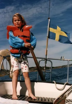 Lilla dottern Stina styr alldeles själv med koncentrerad blick Tomas G,s segelbåt på västkusten den tredje sommaren hon är med.