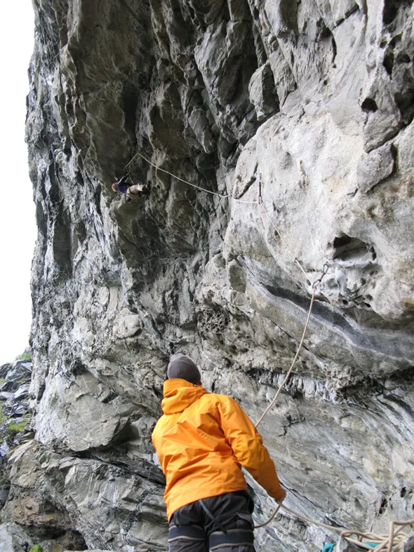 Nis klättrar Gullfaks på Eggum. En lofot vänlig klätter klippa, så pass øverhäng att det går å klättra på när det regnar.