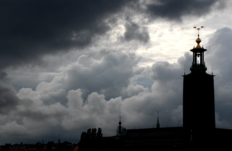 En annalkande storm drar in över stockholms stadshus.