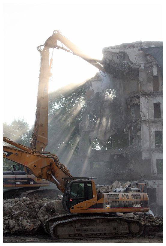 En spontanbild just i rätt ögonblick då solen håller på att gå ner. Maskinerna ser mer ut som monster som äter upp huset. Jag tänker mig dinosaurier nästan.