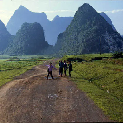 barnen är på väg till skolan i en by angränsande till Li-floden