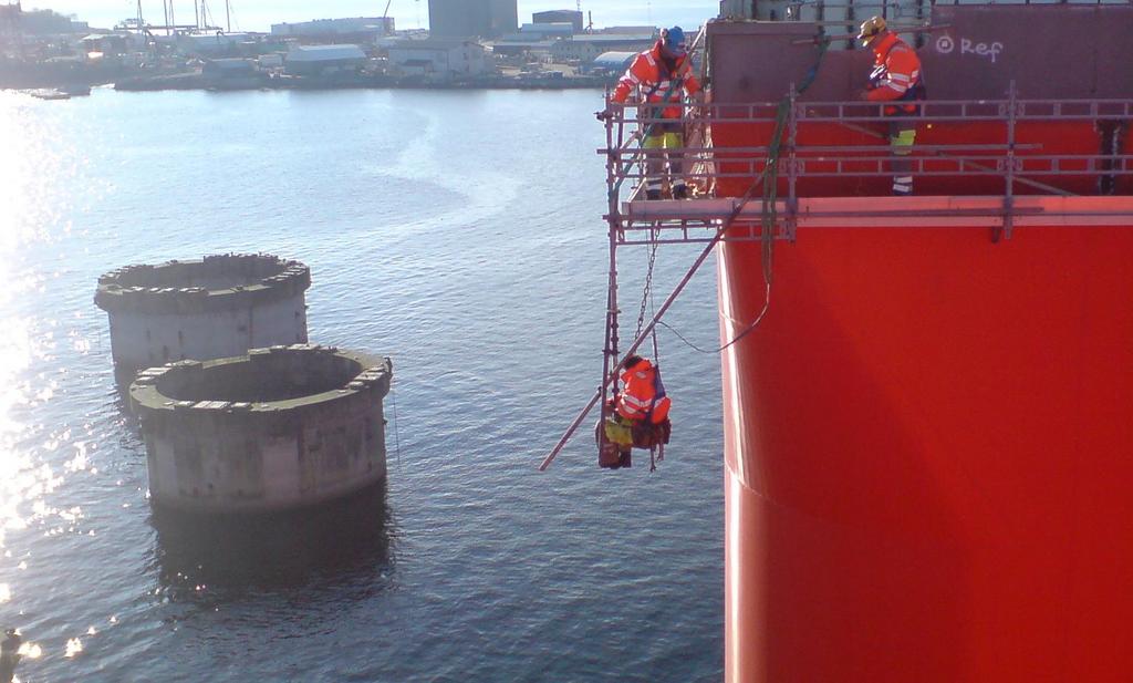 Kanskje ikke ett typisk "utsidan kort", men det er i alla fall utomhus og en onormalt solig dag på min arbetsplats, - Aker Stord. PÅ kortet syns mine kolleger när dom bygger ställning rundt ett av bena på en oljeplattform.