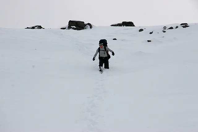 Haha... jo .. det är lite lustigt att behöva gå med skidorna på påskturen och pulsa i snö på höstturen. Men tänk om man hade haft snöskor!? Det är inget jag har tänkt på tidigare, men den på den här turen hade det varit suveränt!