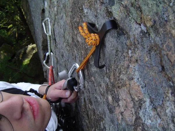 Det blev en betydligt bättre krok i en tvärspricka under denna. Tror kameran ljuger lite, ser lite kort ut till kilen under, blev ändå ett fall på ett par meter när denna gled av. Man bör undvika att skyhooka eller åtminstone skyhooka på det mest solida på etablerade frileder så att man inte förstör crimpar och annat.