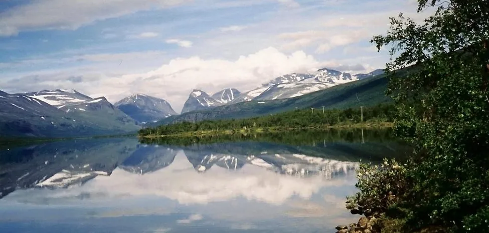 Fantastiskt fint fjällpanorama och man känner nästan myggen surra runt öronen. Möjligen hade jag tagit nåt steg till vänster och undvikit buskaget till höger i bild.