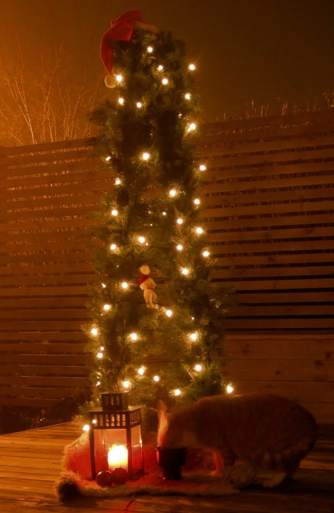 Husets katt fick bli julkort i år. Trots muta i fom av rått ägg gjorde han inte exakt som jag ville, så jag gjorde en julkortsversion i PS, men mina vänner på Utsidan önskar jag God Jul och Gott Nytt Uteår med en bild som inte är manipulerad!