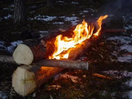 Efter att ha läst boken "Eld" så blev jag och den yngre sonen inspirerade att göra ett försök. Det blev väldigt lyckat. Modellen är lapsk med två stockar; brinner långsammare och med mindre kalldrag än en "svensk" gjord på tre.