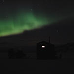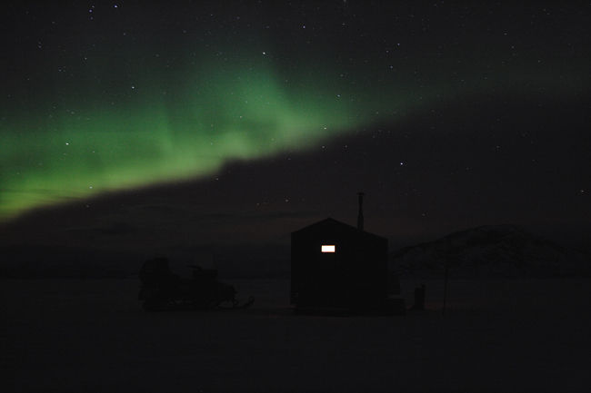 snyggt! norrsken är häftigt. bra gjort att få med de mörka konturerna av stuga, skoter, fjäll så tydligt. och ljuset från lilla fönstret, en människas boning..