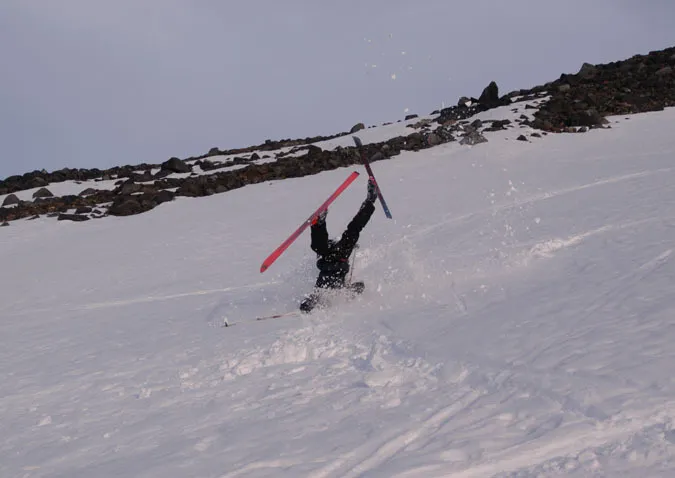 Det var inte så farligt men hans Rivabindning gick av så det blev specialreparation på fjället, höll bra för turåkning men det blev ingen mer telis den veckan...