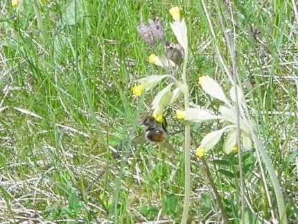 Humlan tar sig en styrketår nektar ur en gullviva.Vi gjorde ett strandhugg under paddeltur med Vuxengruppen Friluftsfrämjandet Ingelstad. Strax innan Bro fann vi denna fina slåtteräng med backsippor och gullvivor.