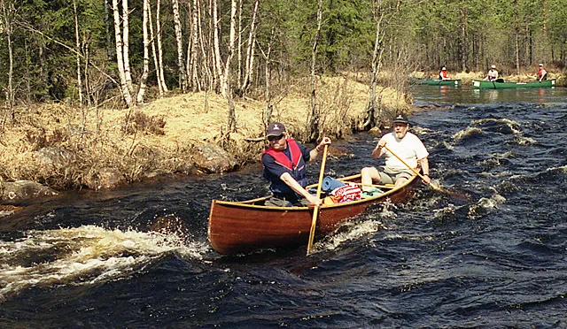 Jag har ju flytväst! Lasse glömde visst sin. Kanoten är ett hembygge i "woodstrip" så den är inte den ömtåliga träkanot ni kanske tror. Den är gjord för att användas! Botten är mycket repig! Modellen är en Prospector som härstammar från mitten av 1800-talet. Min kopia byggde ag för ungefär 15 år sedan.