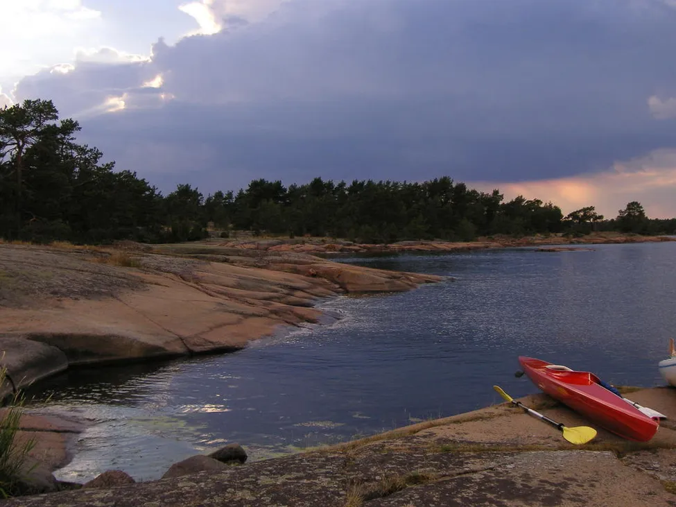 Läckert med den mörka himlen, röda kajaken och gula paddeln. Effektfullt.