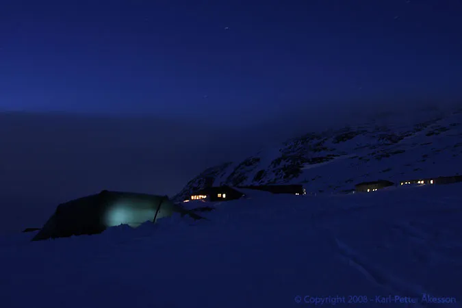 Fantastiskt fin bild med ljuset på himlen och ljuset i tältet!