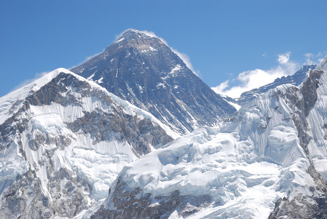 Dag 11. Mount Everest, 8850 m, i mitten. Toppen till vänster, 7205 m. Till höger Nuptse, 7879 m, vars topp inte syns. Bakom Nuptse syns en bit av Lhotse, 8501 m. Bör vara South Col, 7986 m, där kammen är som lägst. Vy från Kala Pattar, 5545 m.
