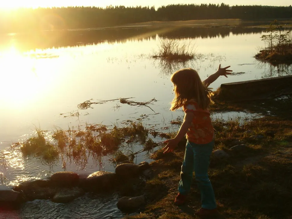 Sen kvällspromenad i vårvärmen med döttrarna till Lillsjöbäcken, där vi roade oss med att kasta kottar.