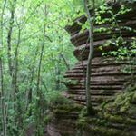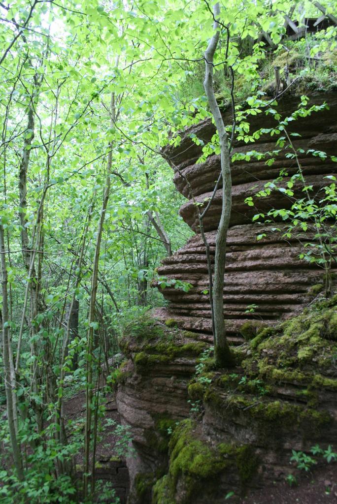 "Rauk" vid Munkängarnas kalkstensklev, även kallad "predikstolen" I bildens överkant syns utiktsplatsen, där man får en fin utsikt över ett böljande grönt hav av lövträd, som ask, alm, bok, ek, lind och rönn. Platsen bildades av ständig bearbetning av Yoldiahavets bränningar, för ca 10 000 år sedan. Nu ligger den forna havsstranden 119 meter över havet.