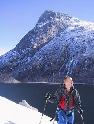 Per beundrar utsikten från nedre delen Gangnesaksla rännan i Norge. En mycket läcker ränna ända ner till fjorden!