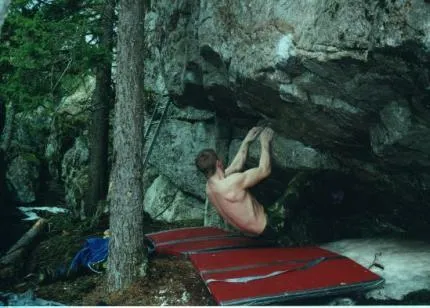Boulderproblem på Nolbyhill. April 2001 gjordes detta problem snön ligger kvar i skuggan. 4 problem klara