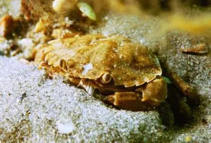 Bland tång satt den här krabban och försökte tugga på en spiralformad snäcka.