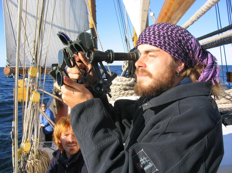Försöker lära mej sextanten ute på Ålands hav, seglade 8 dagar med skonaren Lovis från Åbo till Stockholm.