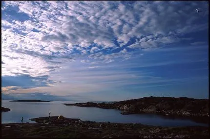 Medpaddlare Magnus och Andreas på Gillöga. Strax före middag efter en lång dag enssamma på havet, den underbara förstaveckan i juli 2000
