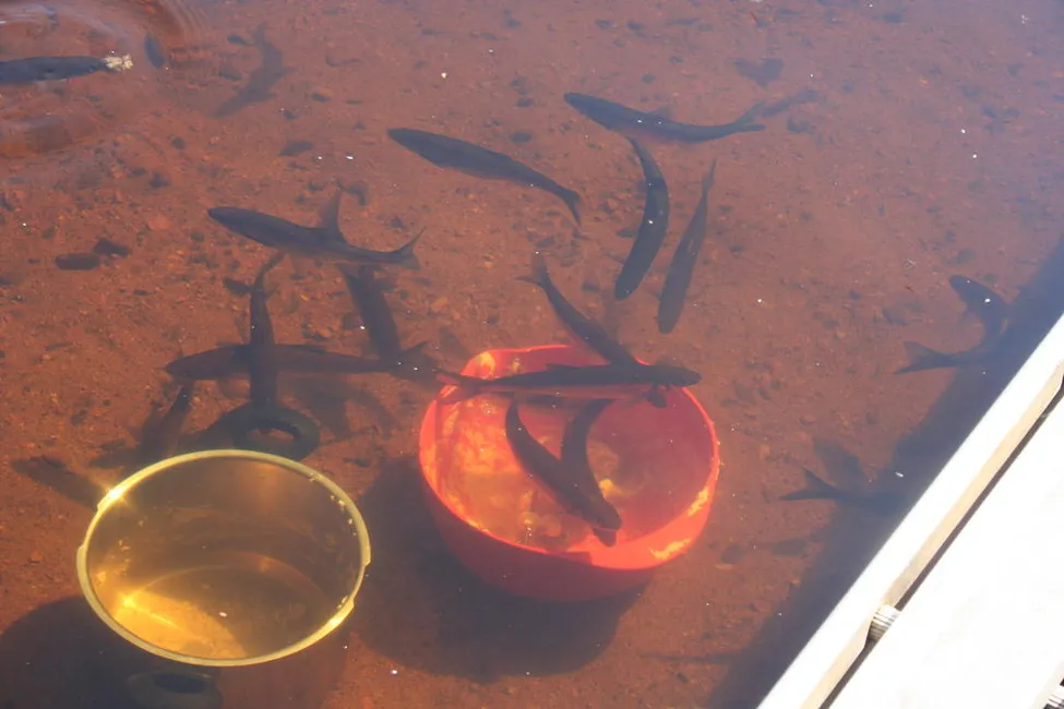 Vad jag har förstått så äter de lite av varje. Och tydligen har de kommit till bryggan varje sommar i trettio års tid. På vår sida udden är näringskedjan omvänd, så dit törs de inte komma...